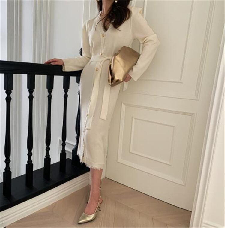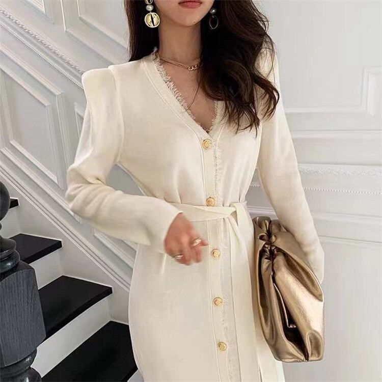 ◎【送料無料】きちんと感をGET Vネック 受け取って腰 単体ボタン ニット ワンピース ロングスカート