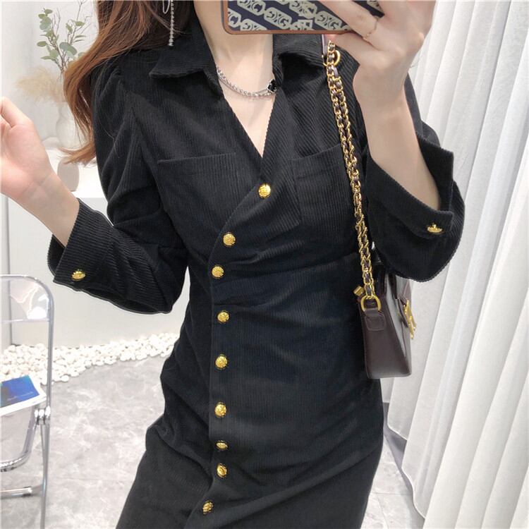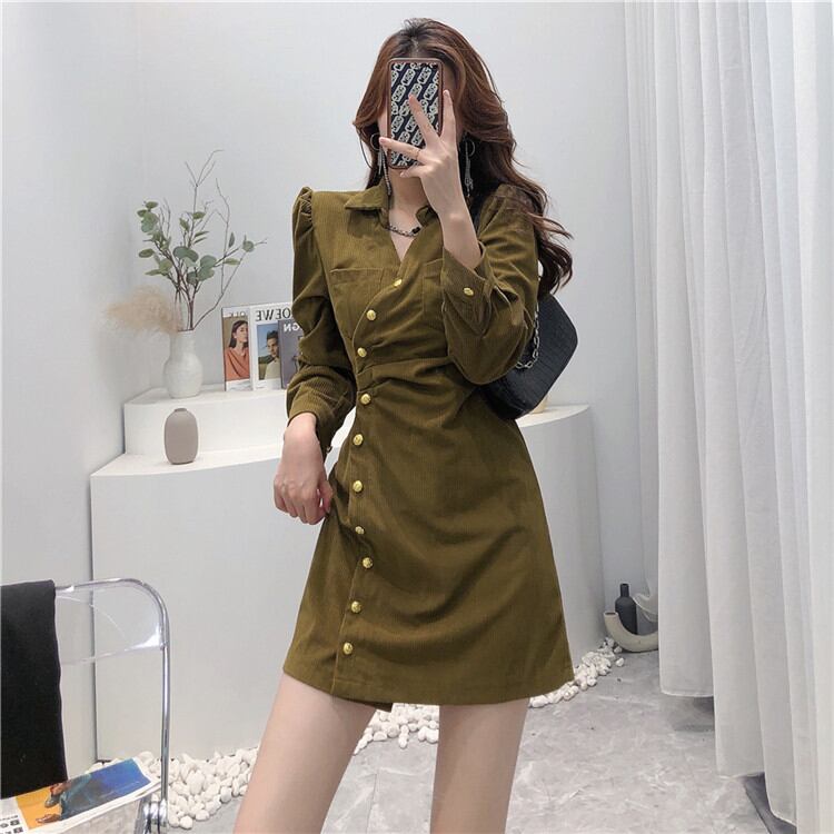 秋冬の新作 レトロ ワンピース ファッション コーデュロイ パフスリーブ スリム