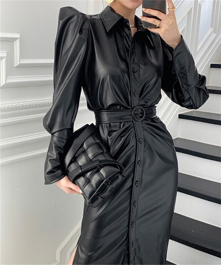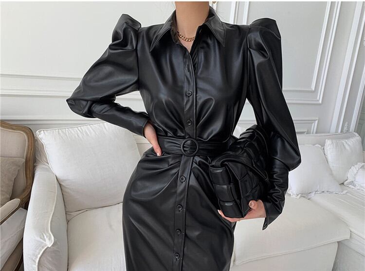 ワンピース ベルト付き 受け取って腰 スプリット パフスリーブ 気質 単体ボタン