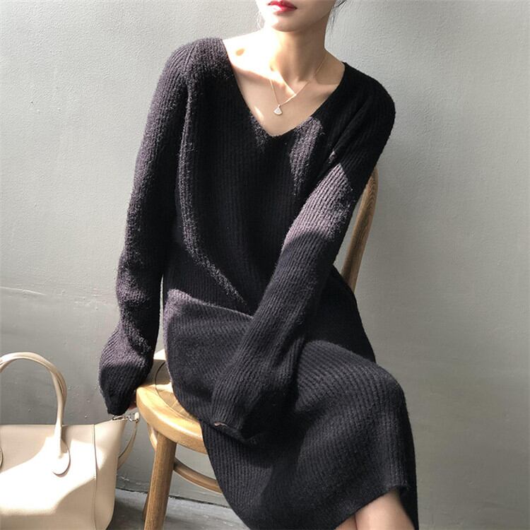 ◎【送料無料】雑誌やSNSで話題 Vネック ニットワンピース レディース 2021年冬 新作 韓国版 ゆったりする
