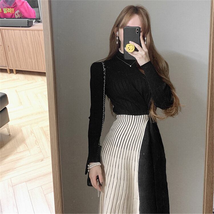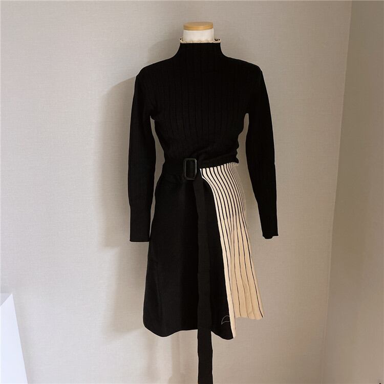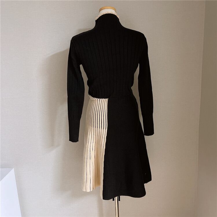 ◎【送料無料】さらりと着られてシーズンムード満点 カラーマッチング ニットワンピース 暖かい 厚手 エレガント