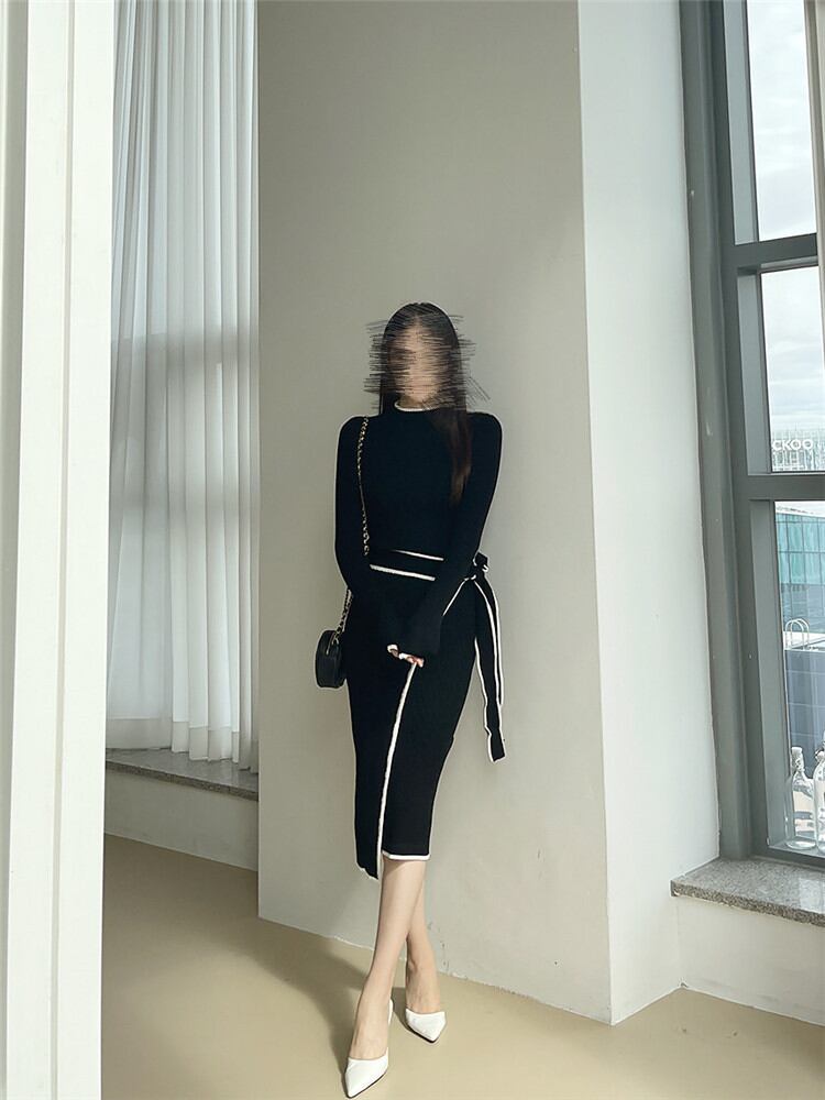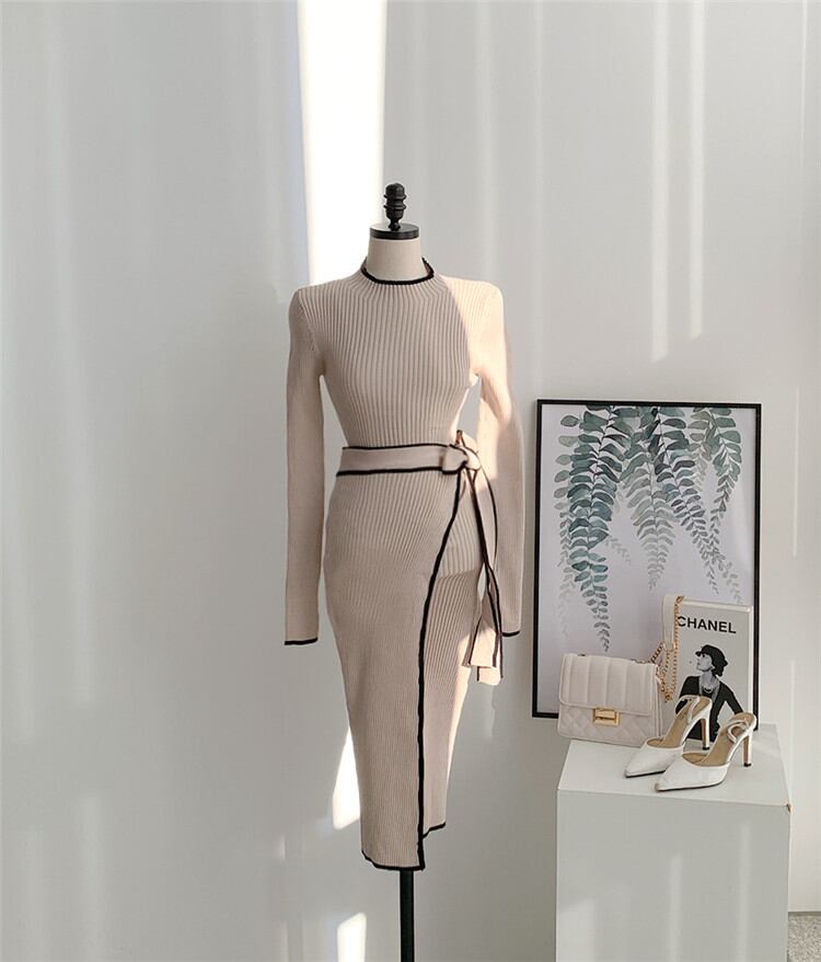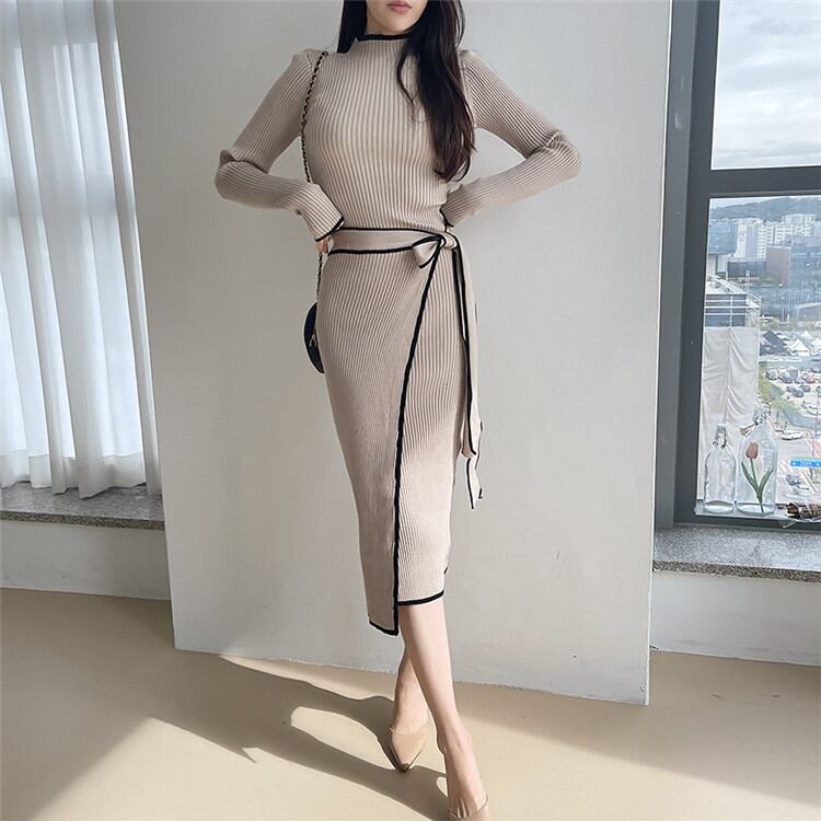 スリム カラーマッチング 中・長セクション 暖かい 厚手 セーター バンディング ニット ワンピース