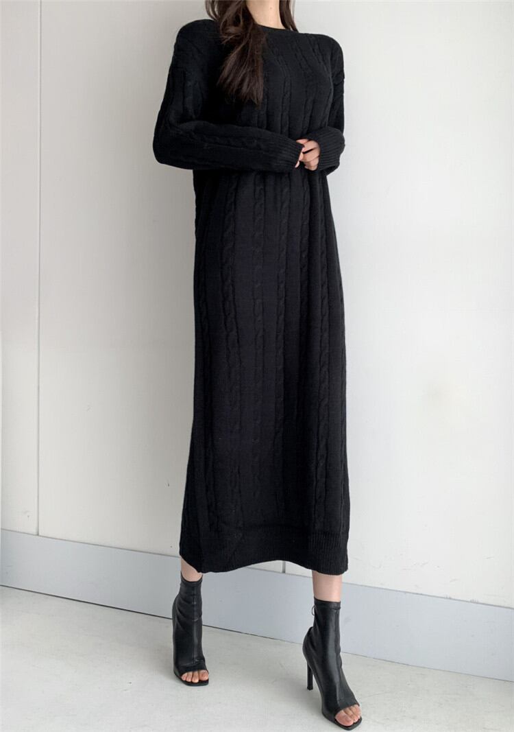 ◎【送料無料】大人の女性は後ろ姿で魅せる ラウンドネック スプリット ニット ワンピース 中・長セクション 秋 冬 厚手
