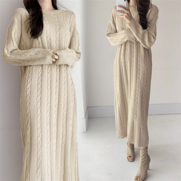 スプリット ニット ワンピース 中・長セクション 秋 冬 厚手 ベースシャツ レトロ 麻の花 女性