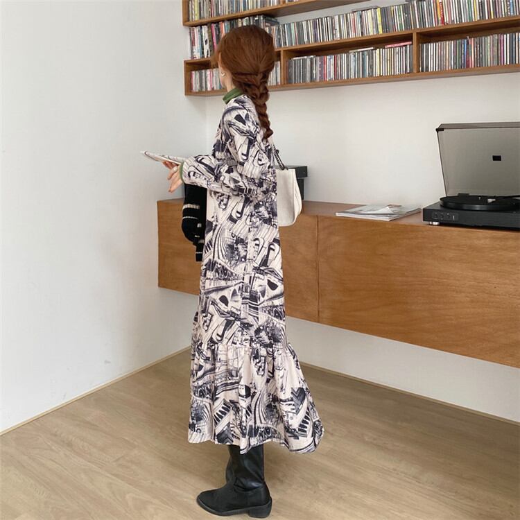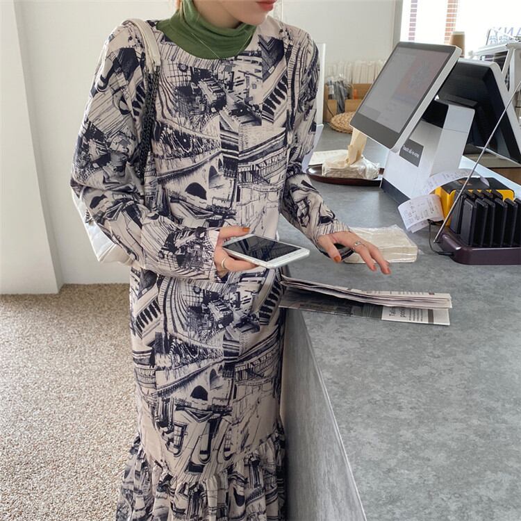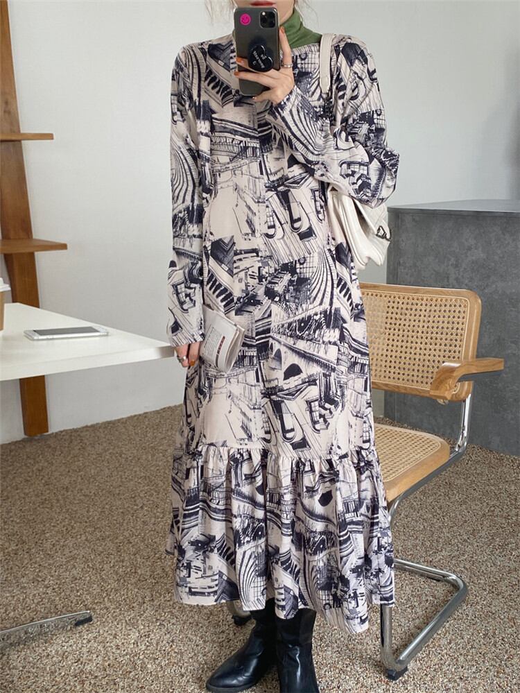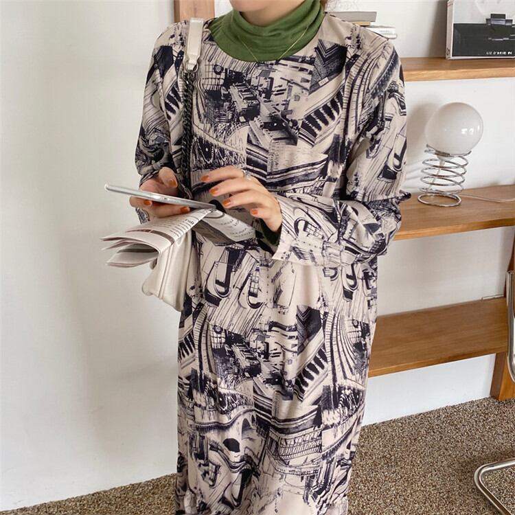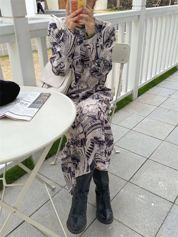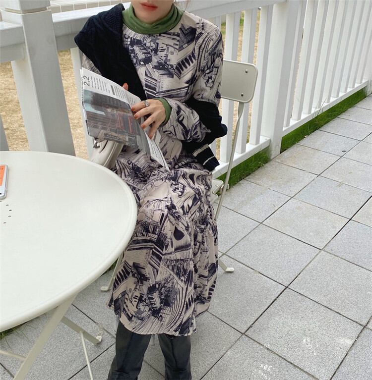◎【送料無料】トレンド感をマーク プリント 縫付 長袖 ワンピース ロングセクション 怠惰な風 ヤングスタイル