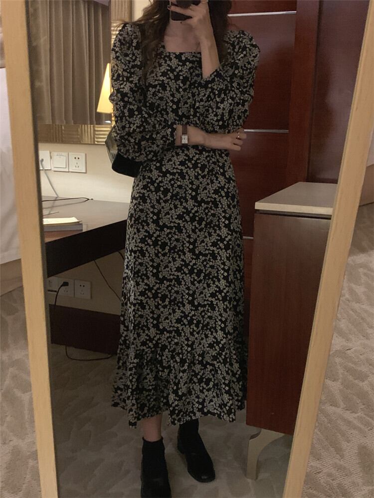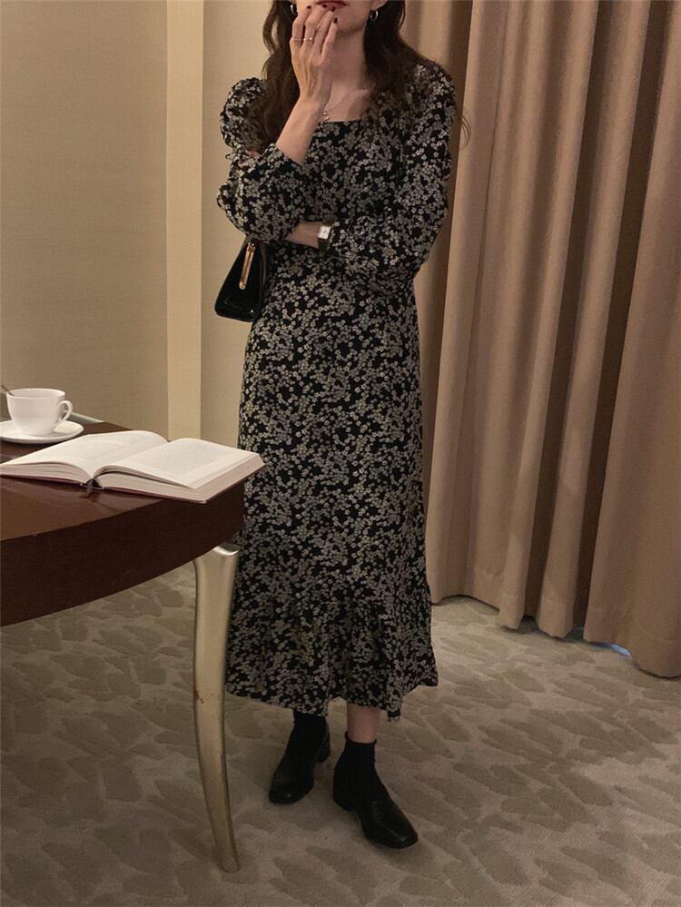 ◎【送料無料】簡単スタイルアップ 気質 スクエアネック フローラル シフォン フィッシュテールスカート 受け取って腰