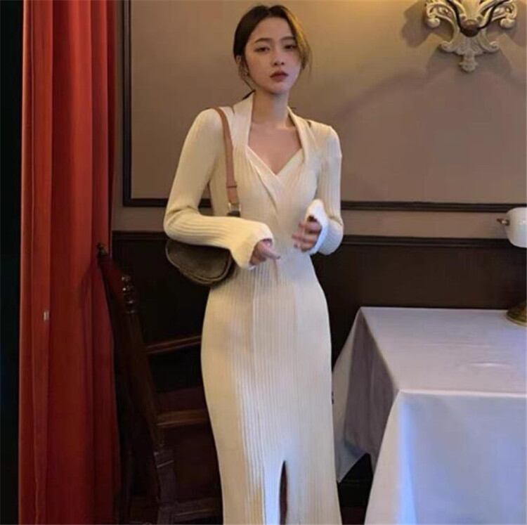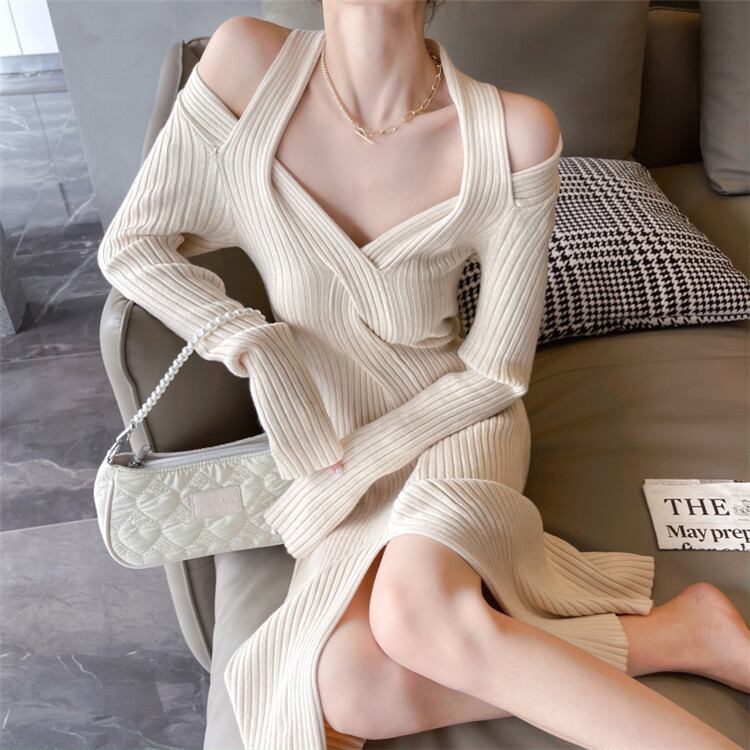 ◎【送料無料】オフショルダー 秋冬新作 レトロ スプリット スリム Vネック ニットワンピース