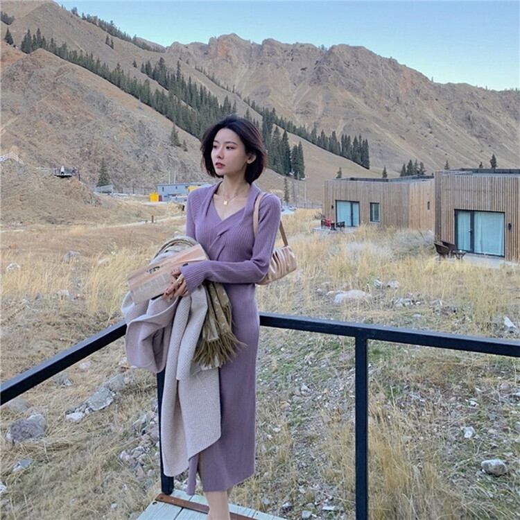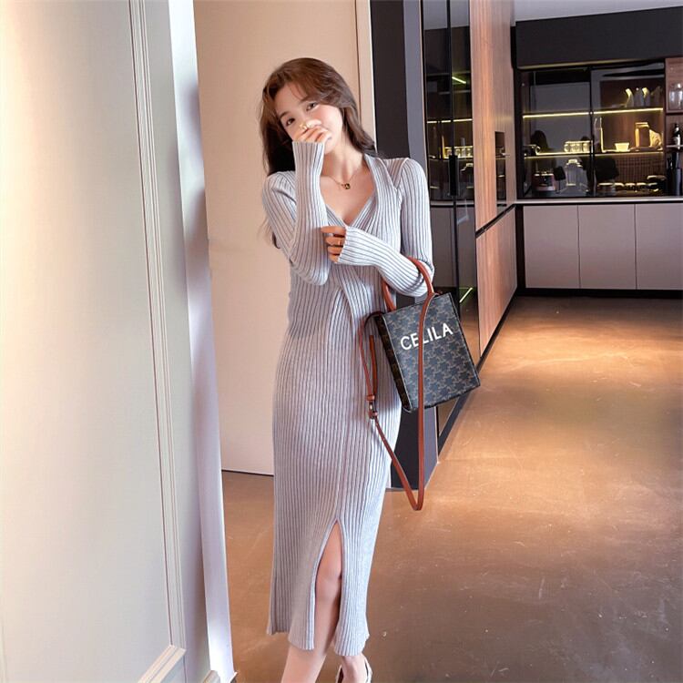 オフショルダー 秋冬新作 レトロ スプリット スリム Vネック ニットワンピース