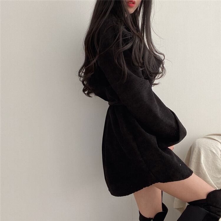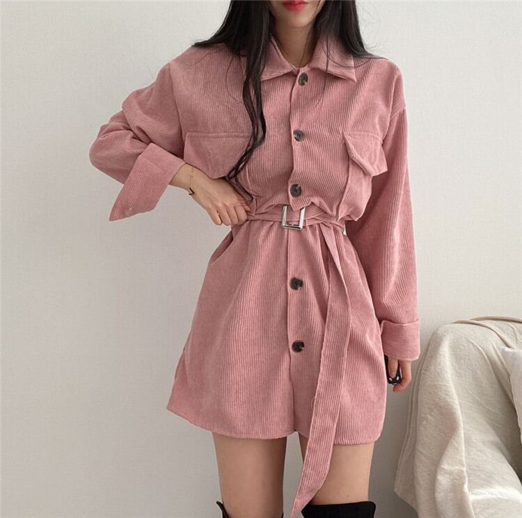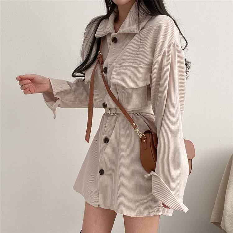 ◎【送料無料】高レビュー可愛い ダブルポケット ラペル 受け取って腰 単体ボタン コーデュロイ シャツワンピ