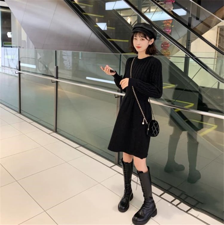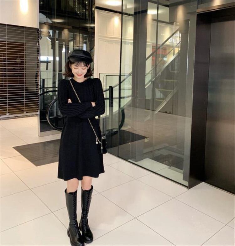◎【送料無料】2021年秋冬新作 細身 ハイウエスト スリム ニット 麻の花 縫付 ワンピース