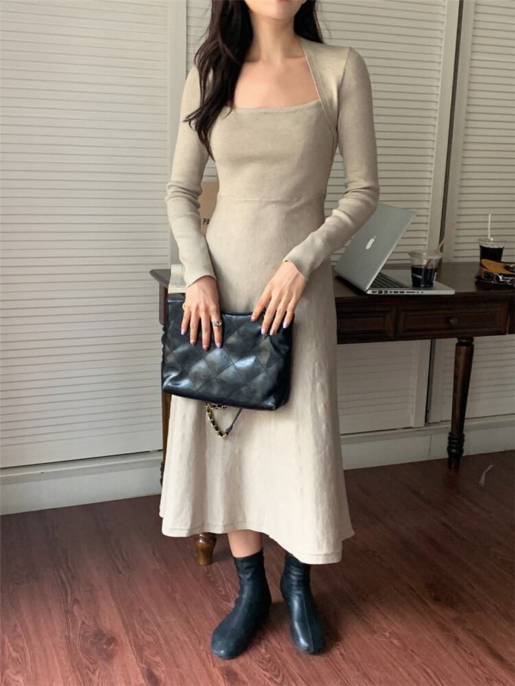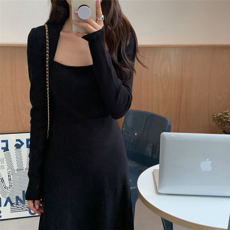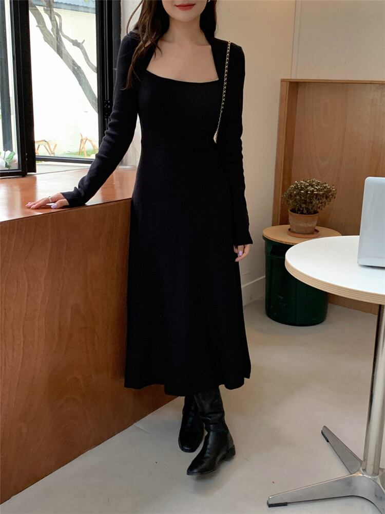 スクエアネック ワンピース 受け取って腰 スリム ニット 中・長セクション カジュアル