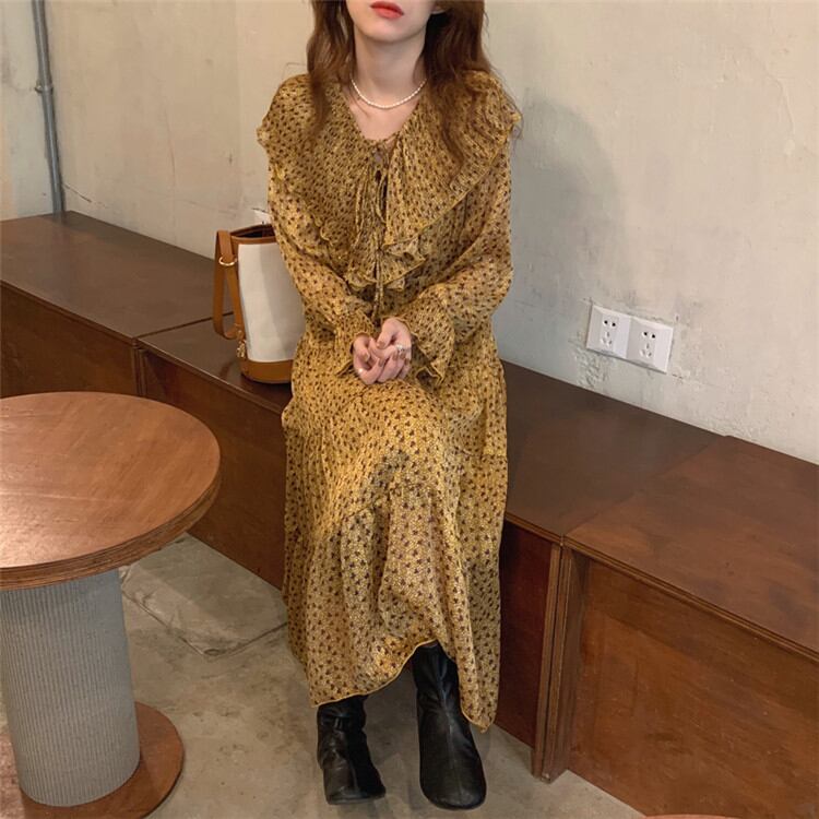 ◎【送料無料】最後の仕上げに1枚 プリント フリル シフォン ワンピース 小さい新鮮な sweet系 大人気