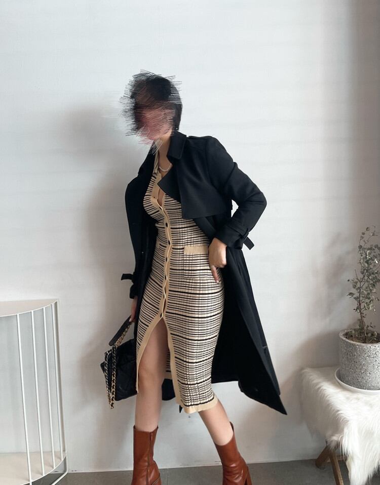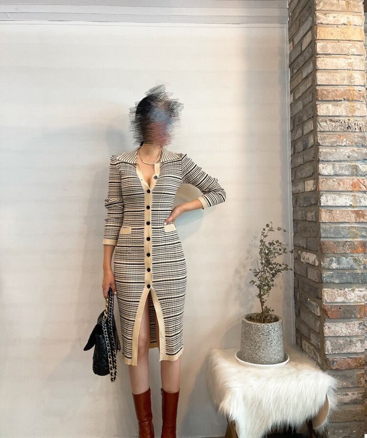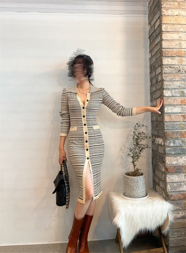 単体ボタン ボーダー スプリット ニット ワンピース スリム 大人気 エレガント