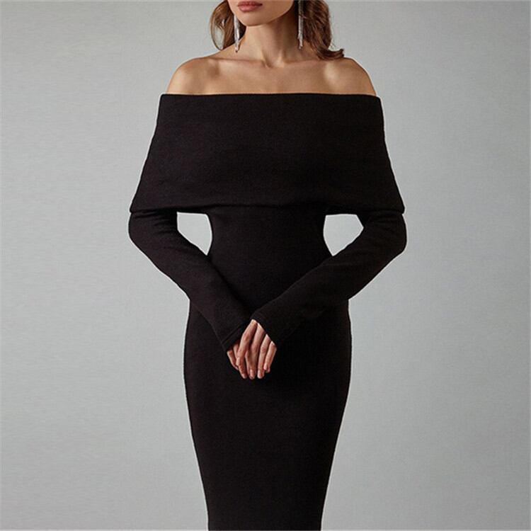 ◎【送料無料】2021年秋冬新作 タイト ワンピース スリム 長袖 気質 ぬいぐるみ オフショルダー