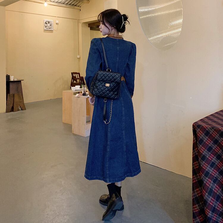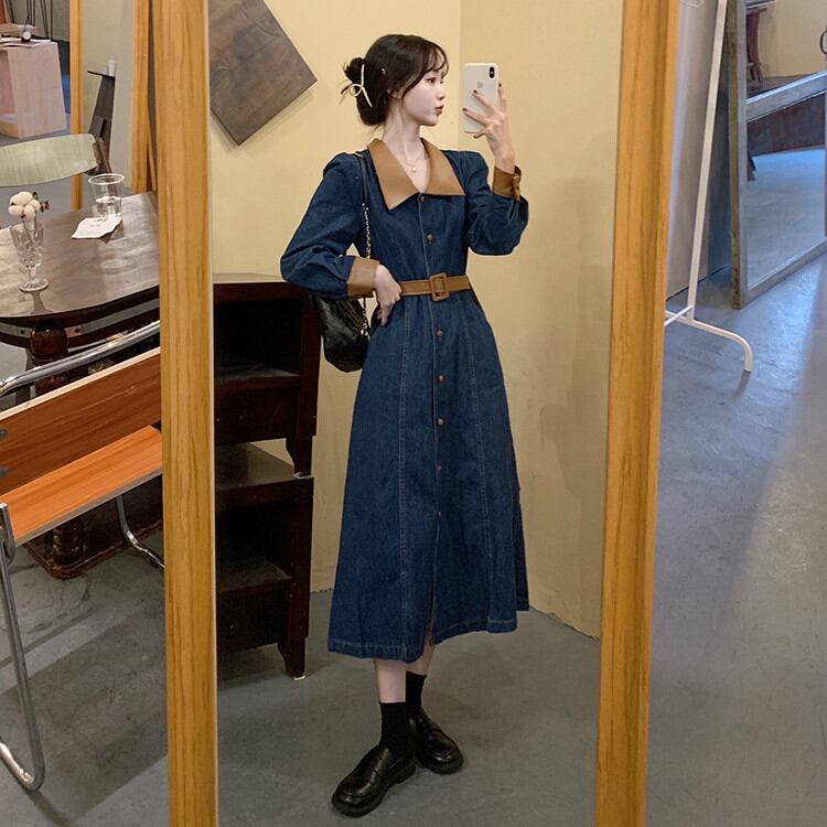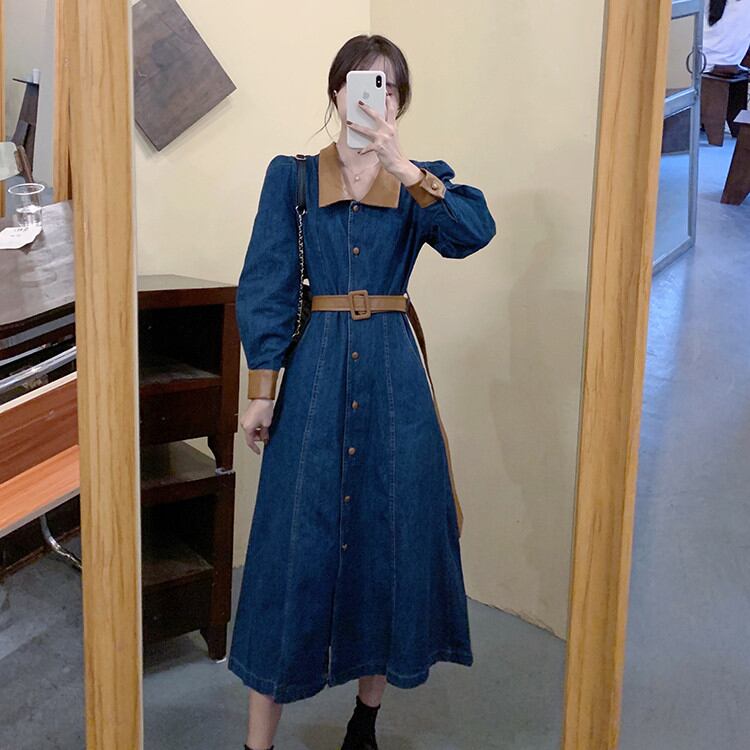 ◎【送料無料】受け取って腰 単体ボタン 大きいサイズ レトロ ロングセクション デニムワンピース