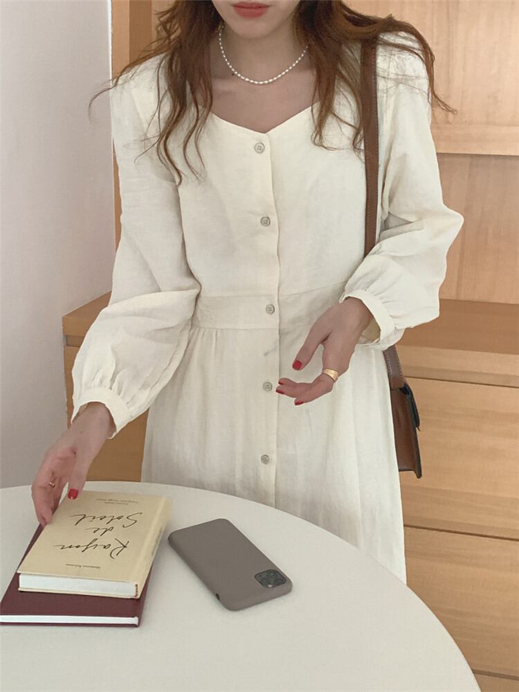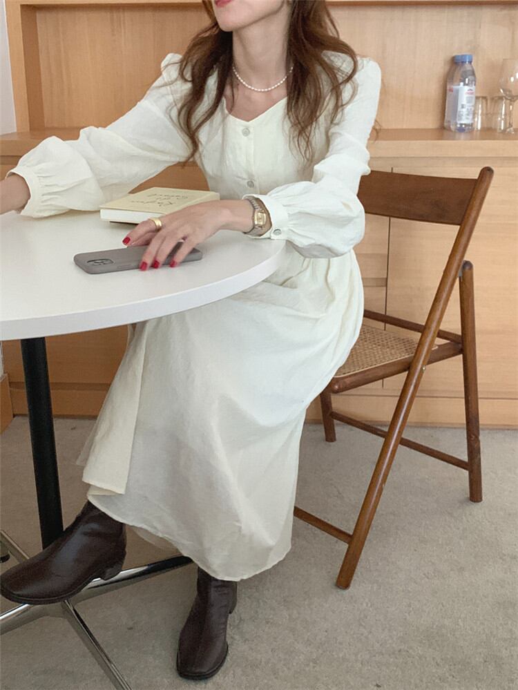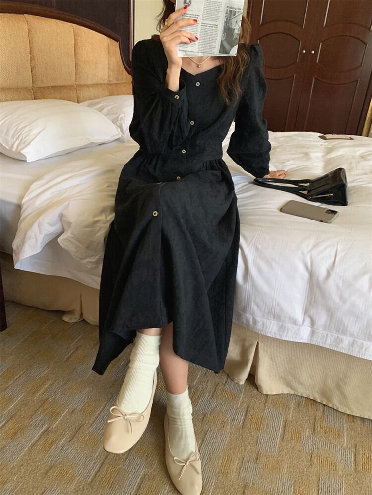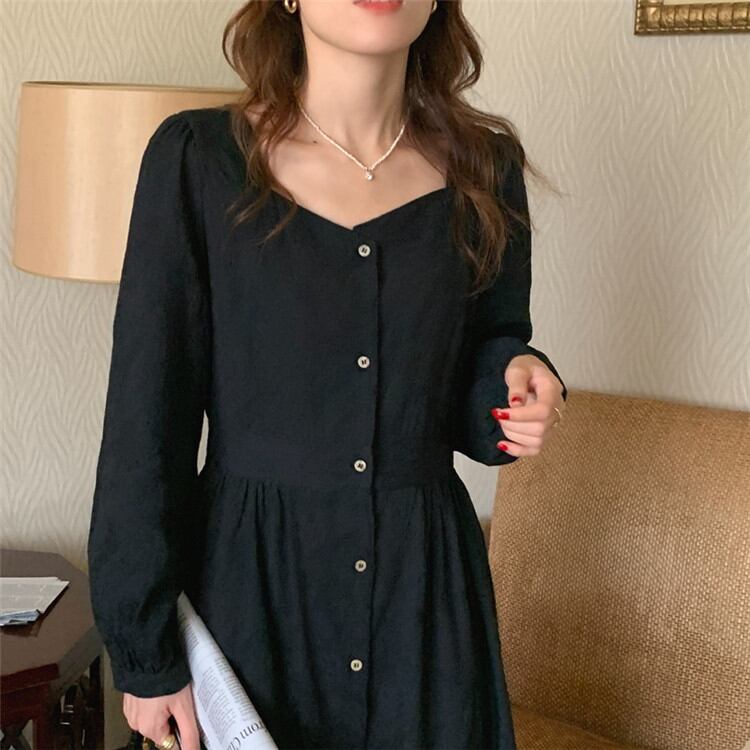 ◎【送料無料】秋冬の服にちょうど良い スクエアネック レトロ 単体ボタン ワンピース ジェントルスタイル スリム