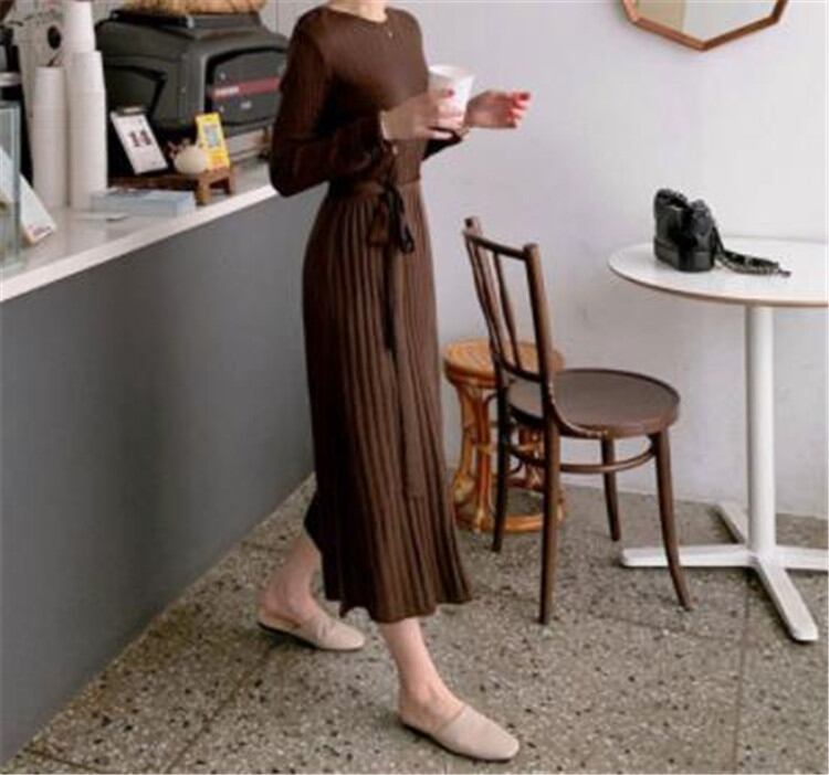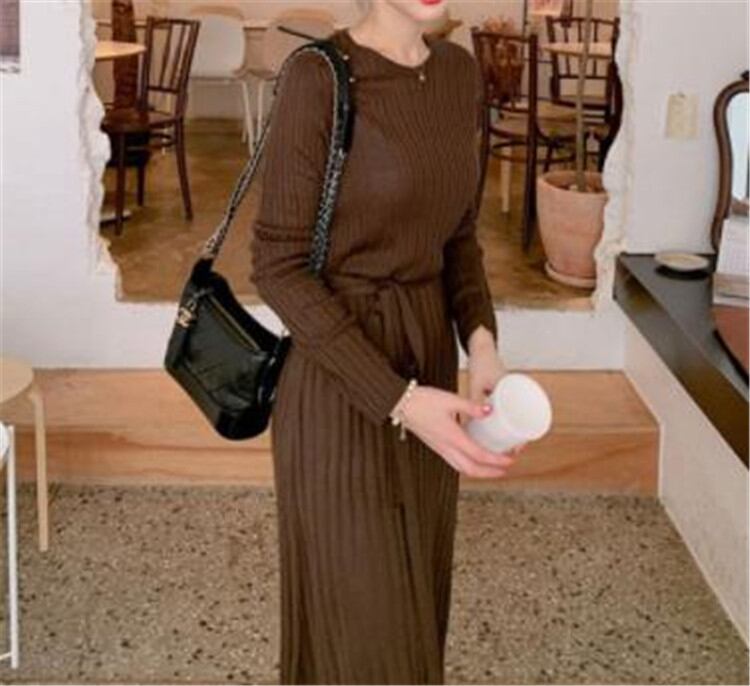 ニット ワンピース セーター ラウンドネック 受け取って腰 レトロ ピュアカラー