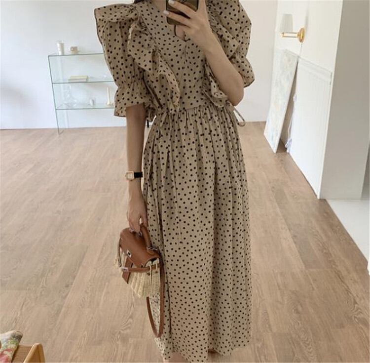 ◎【送料無料】シフォン ワンピース ゆったりする カジュアル エレガント ロングスカート ドット フリル