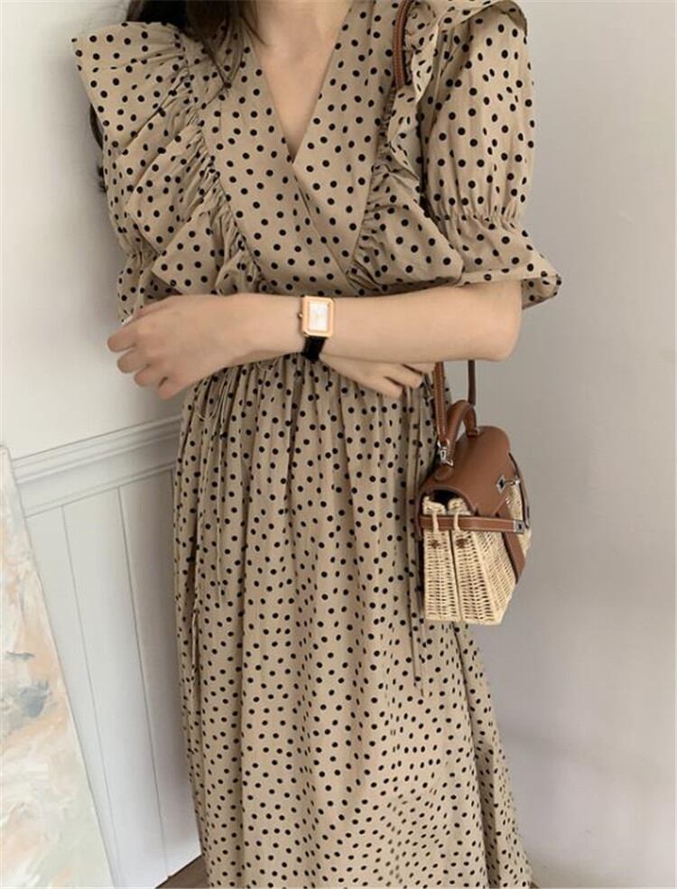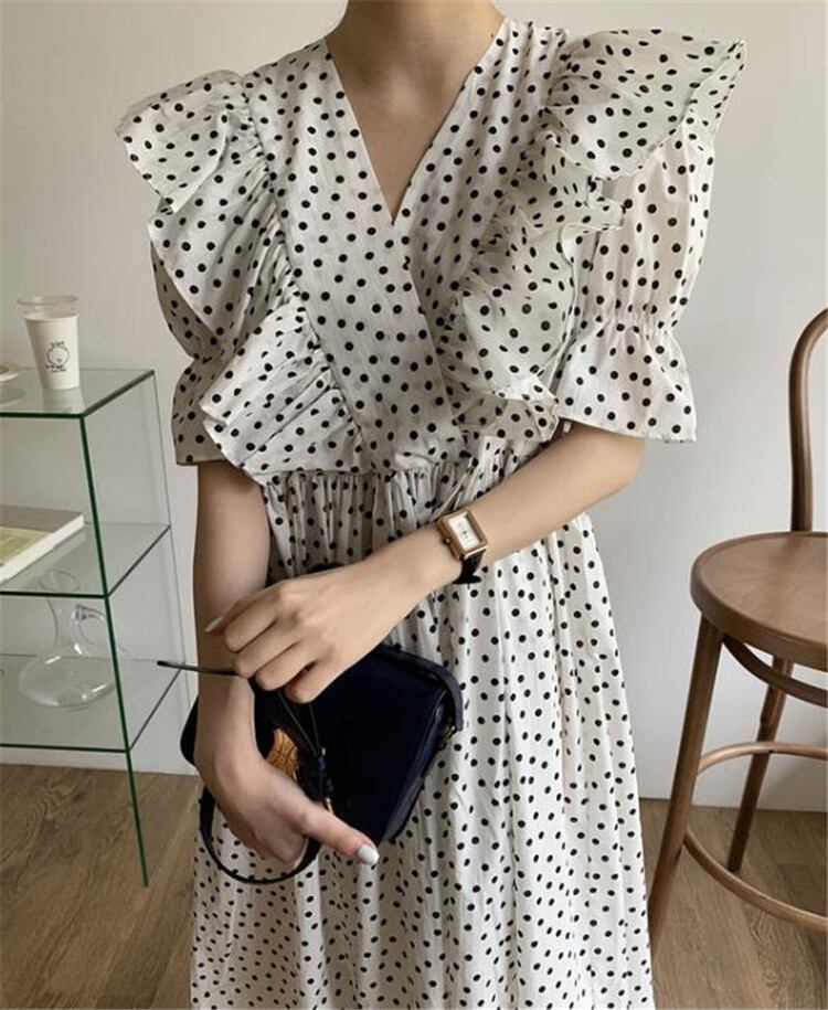ゆったりする カジュアル エレガント ロングスカート ドット フリル Vネック 大きい裾