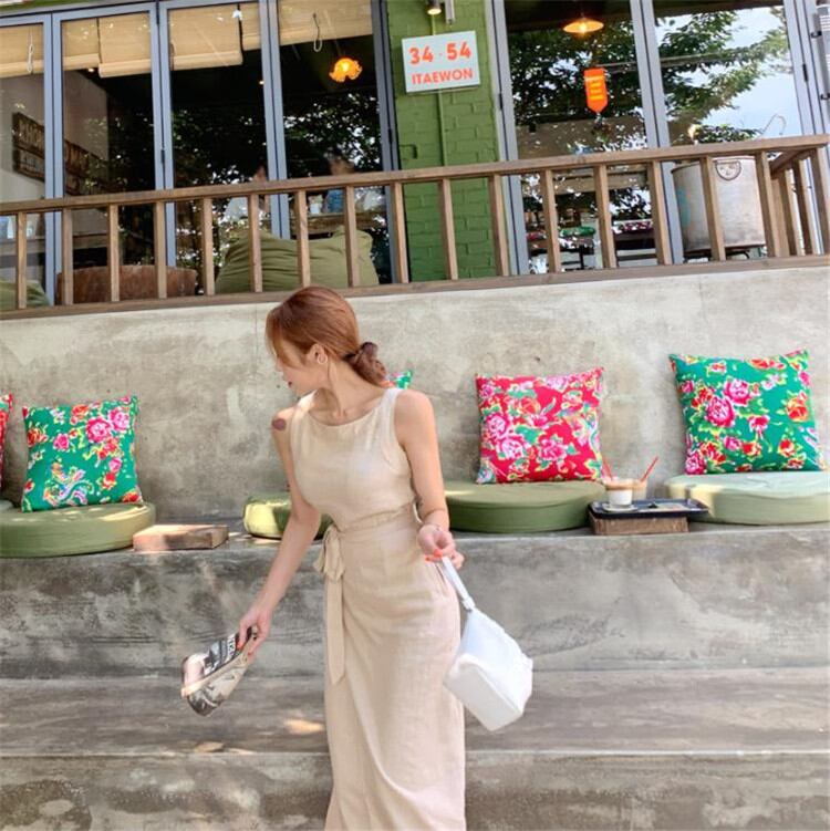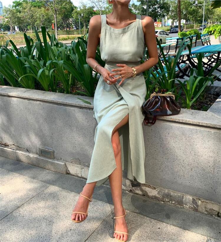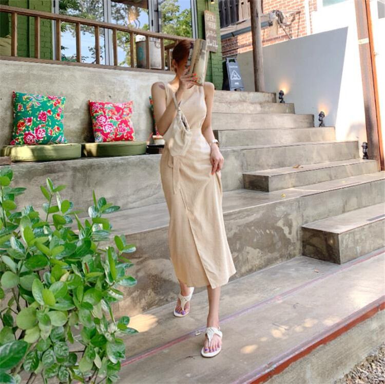 ◎【送料無料】改心率が極めて高い INSスタイル レトロ レースアップ ロング スリット 袖なし スリング ワンビース