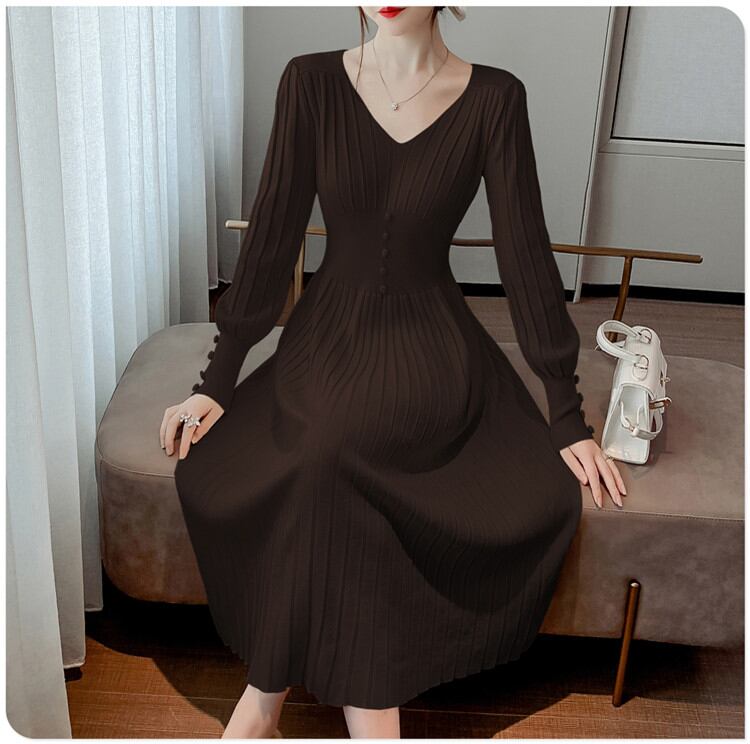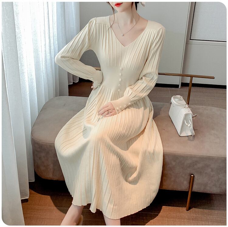韓国ファッション ニットワンピース中・長セクション 長袖 Vネック 気質