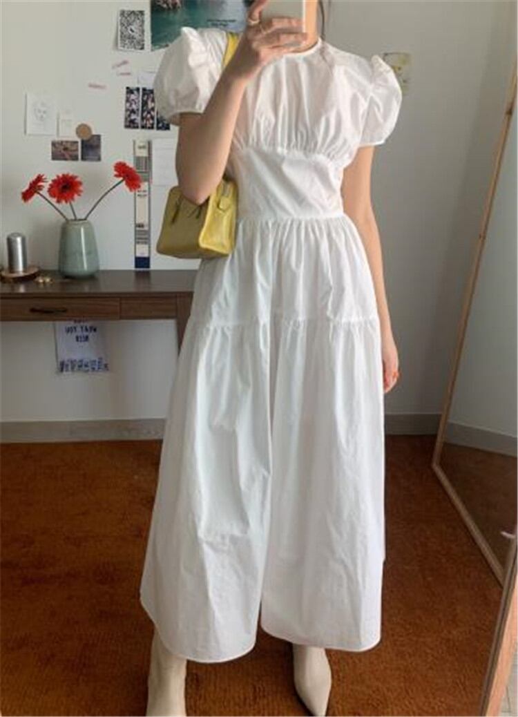 ◎【送料無料】百掛け 大人気 背透けて パフスリーブ ワンピース 女性 中・長セクション 大きい裾 シンプル