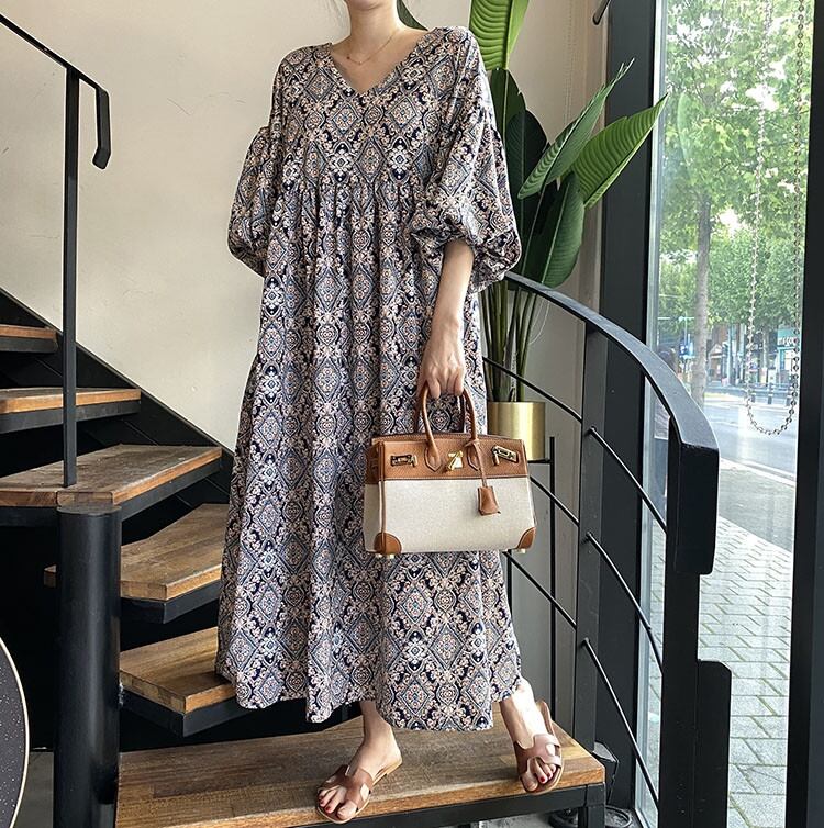 ◎【送料無料】デイリーに使える 中国の風 ランタンスリーブ エスニックスタイル ロングセクション ワンビース 気質