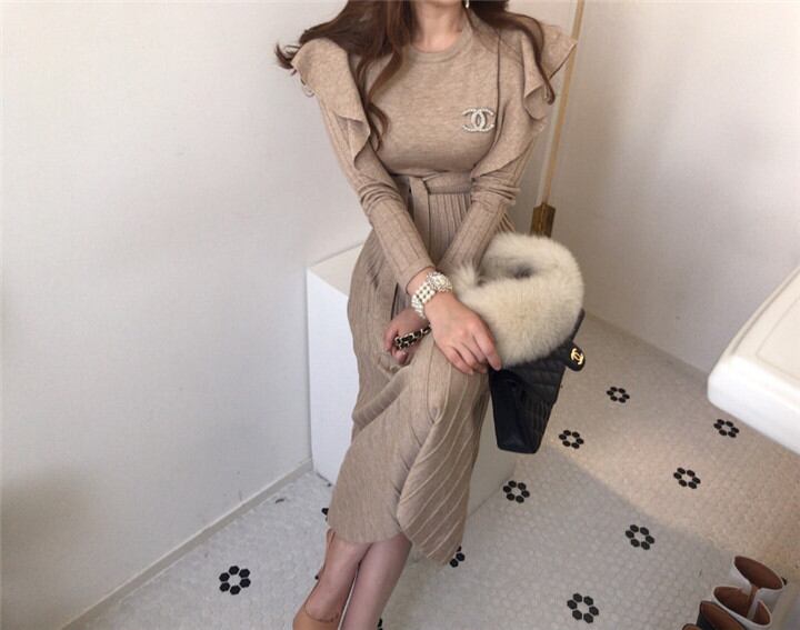 ◎【送料無料】フリル 腰を括る ニット ワンビース セーター 中・長セクション 百掛け 上品映え デザインセンス