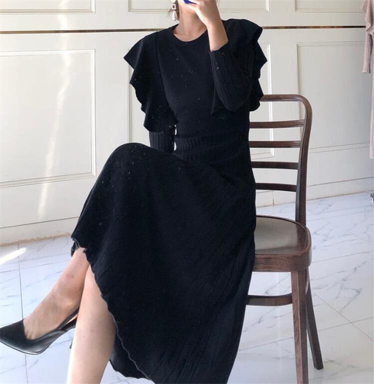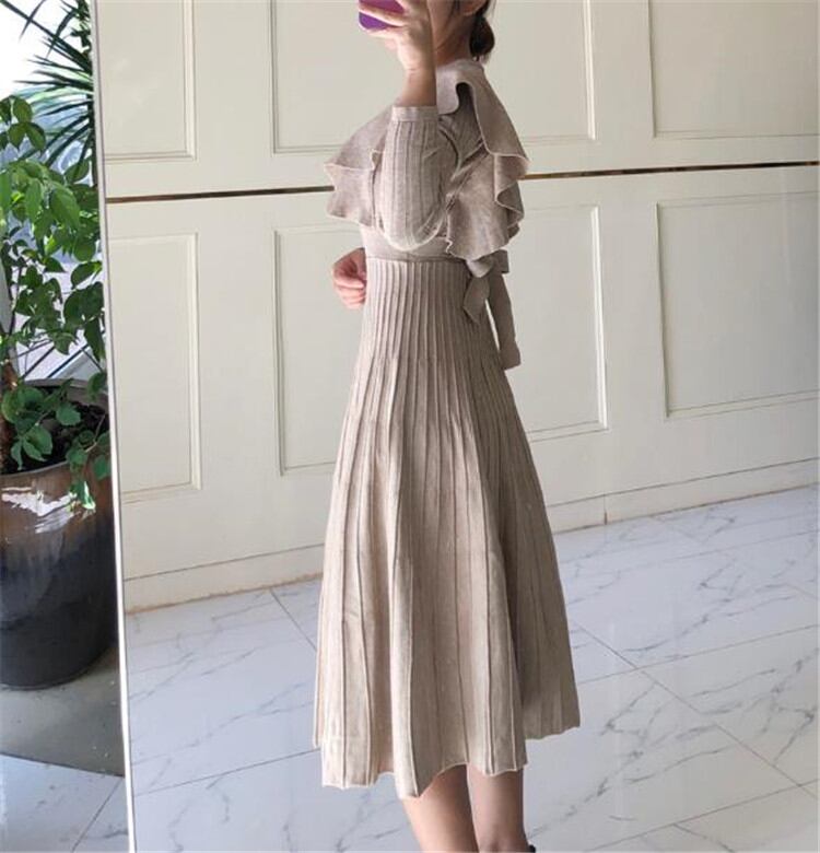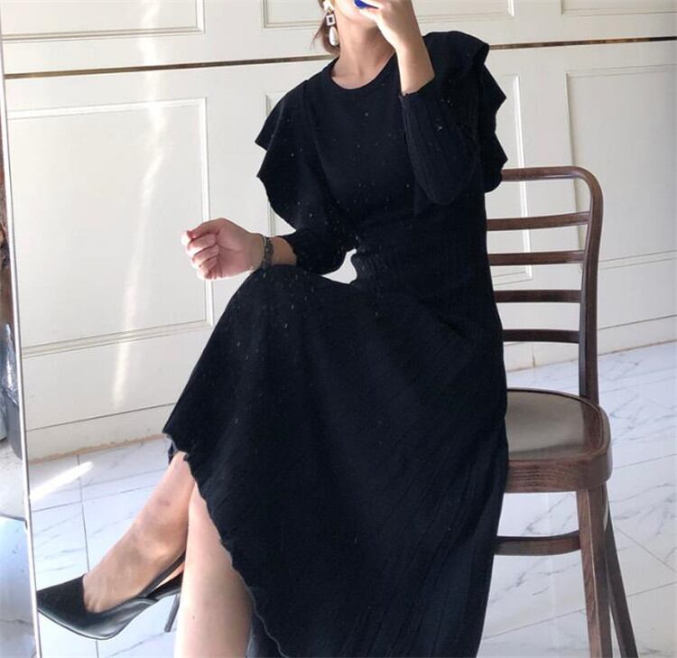 ◎【送料無料】【クーポン併用で最安値更新】通勤する ラウンドネック sweet系 フリル ステッチ 長袖 ニットワンピース