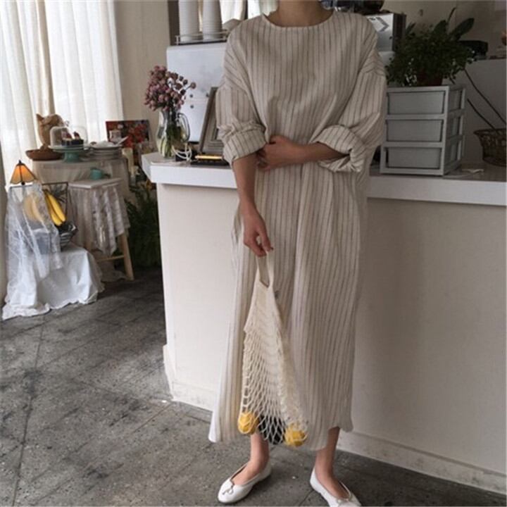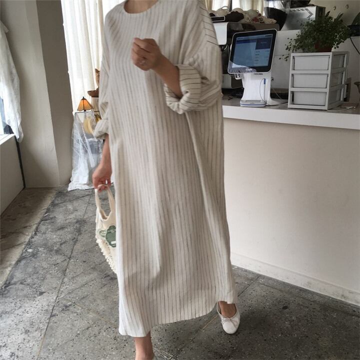 韓国ファッション ワンピース フリル 切り替え バイカラー 体型カバー 着痩せ ストライプ柄