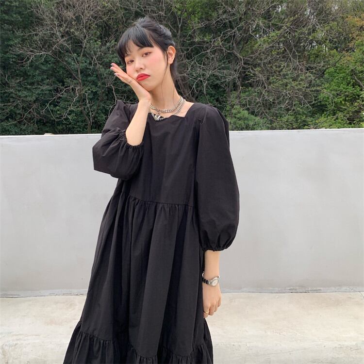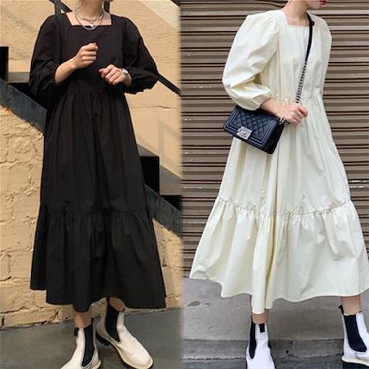 INSスタイル 気質 パフスリーブ スリム 新品 スクエアネック 長袖 ロングスカート