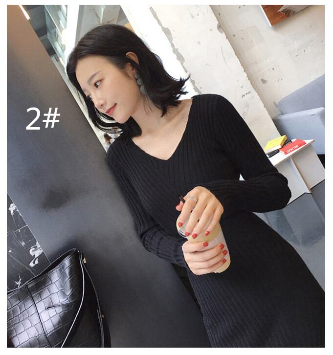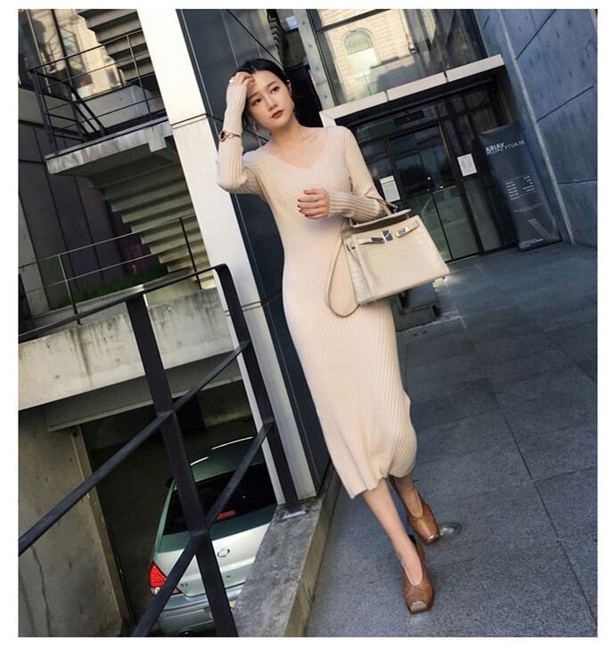 ◎【送料無料】ニットワンピース タイトワンピース 長袖ワンピース ロングワンピース 秋冬新作 Vネック
