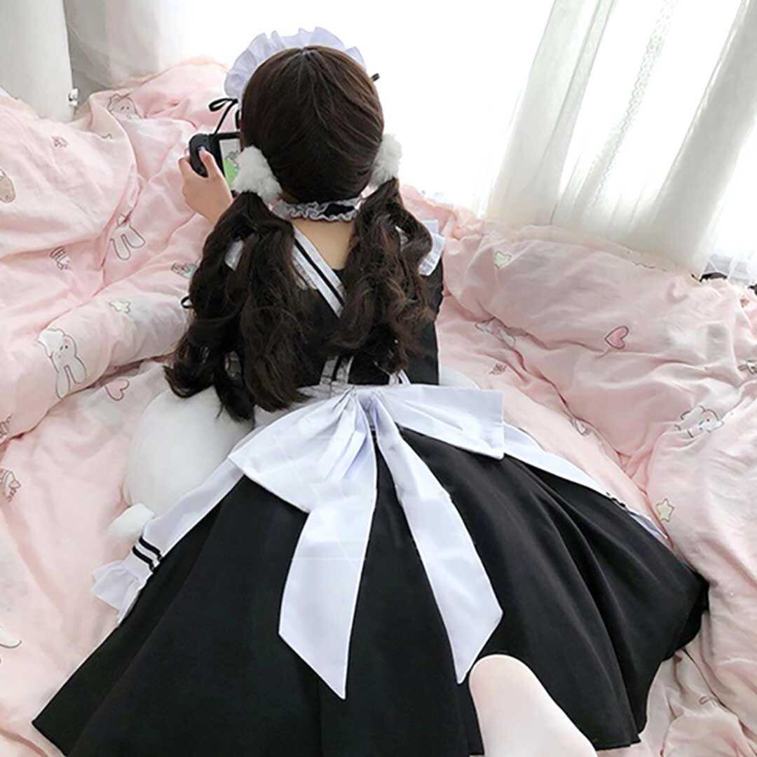 ブラックワンピース、ホワイトエプロン、ホワイトベルト、リストバンド、フリルカチューシャ、フリルチョーカー(マジックテープで調節可能)、レッグフリルベルト(脚用)