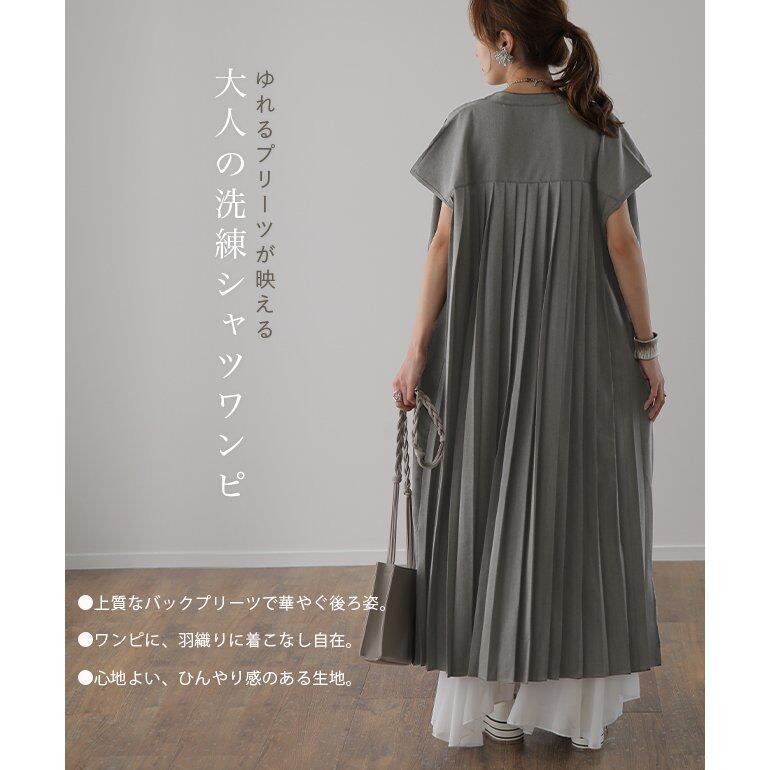 ◎【送料無料】2022春夏新作 バックプリーツ シャツワンピース ロングシャツ 半袖 1枚で2役 体型カバー レディース