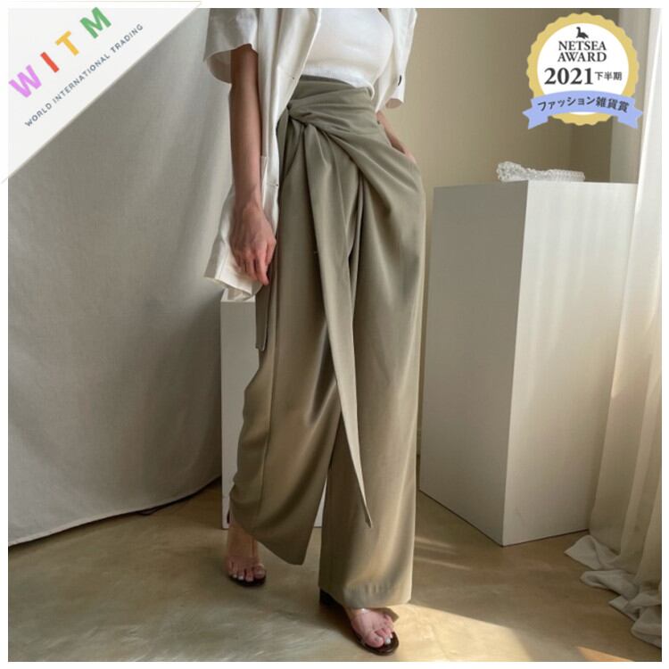 ◎【送料無料】2022春夏新作 ロング丈ズボン ロングパンツ ワイドパンツ ハイウエスト レディース 着痩せ リボン付き
