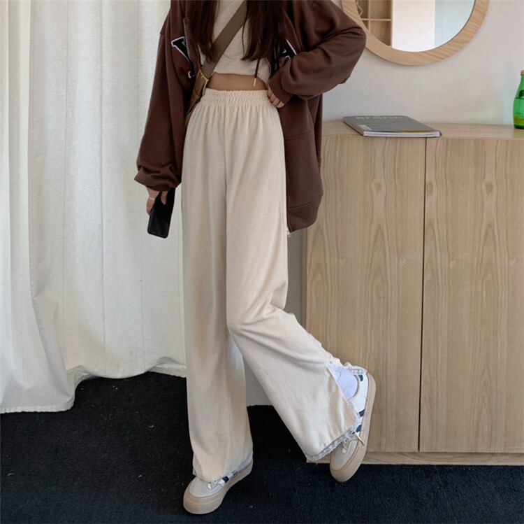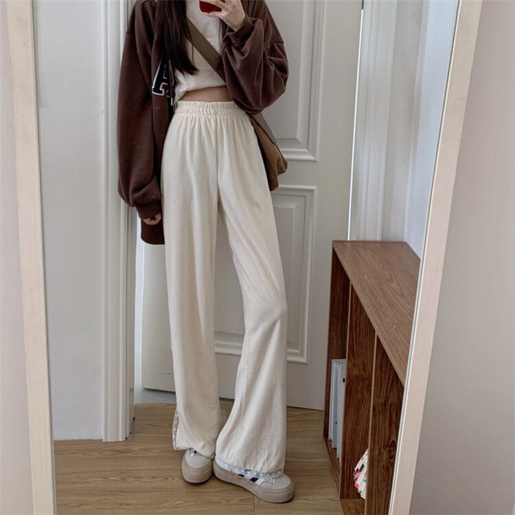 縫付 レース ハイウエスト スリム ワイドレッグパンツ スプリット カジュアル 大人気