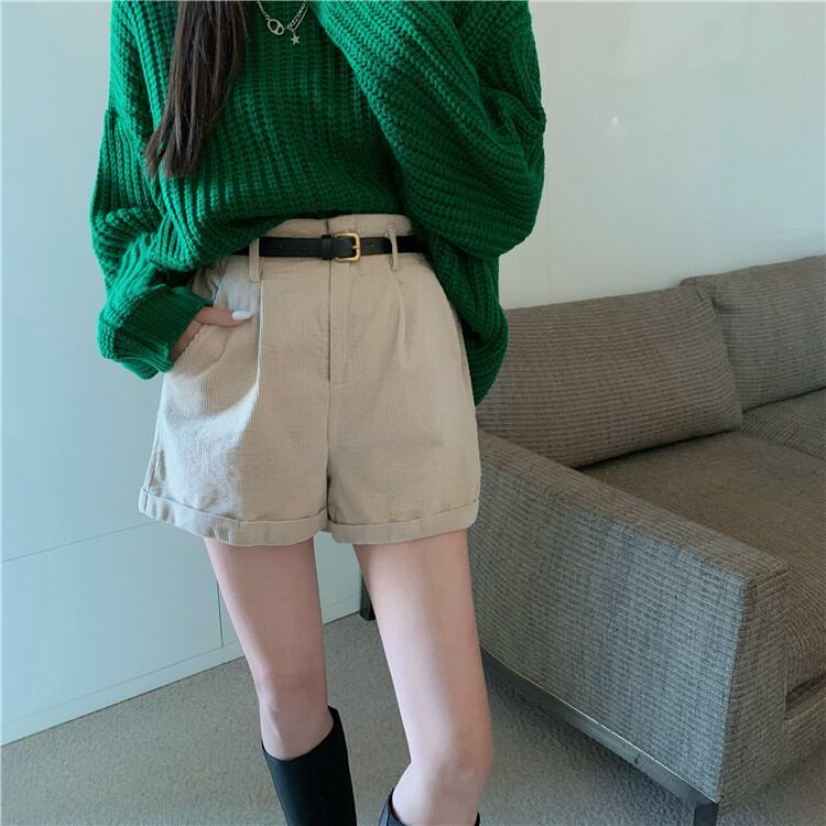 ◎【送料無料】カジュアルスタイルを旬に変える レトロ ハイウエスト コーデュロイ スリム ショートパンツ ベルト付き