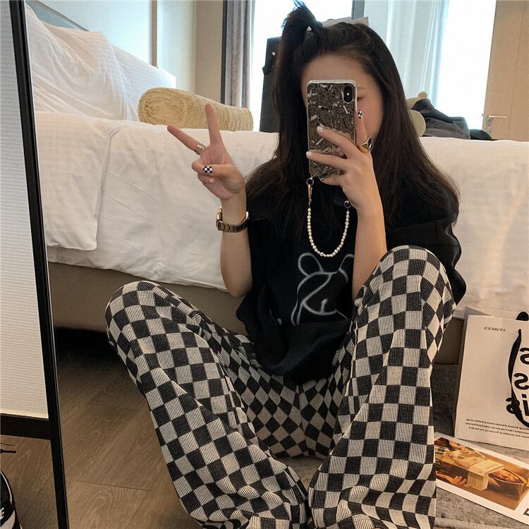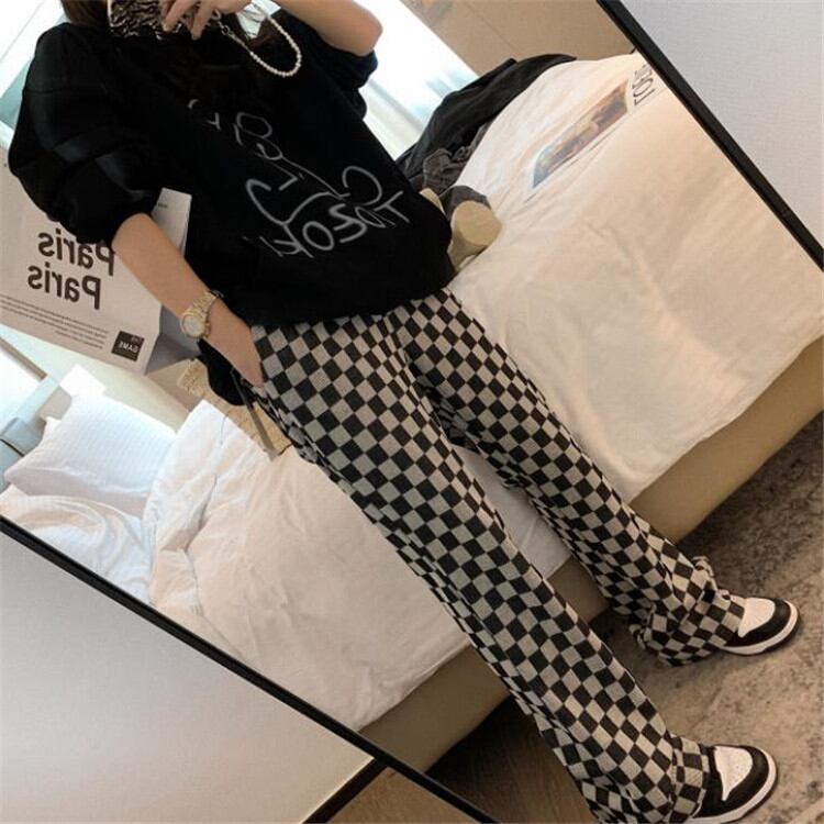 ワイドパンツ 格子縞 レトロ ハイウエスト ファッション フレアパンツ 2021年秋冬