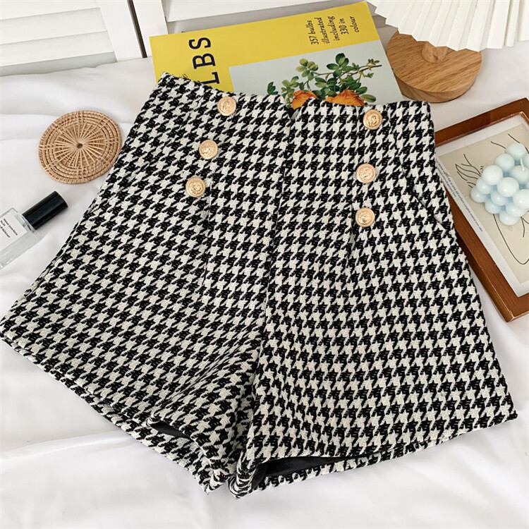 ◎【送料無料】イレギュラー ショートパンツ ハイウエスト ファッション 千鳥格子 ダブルボタン