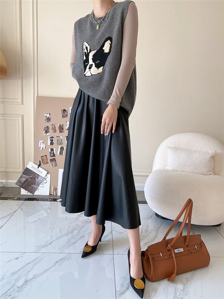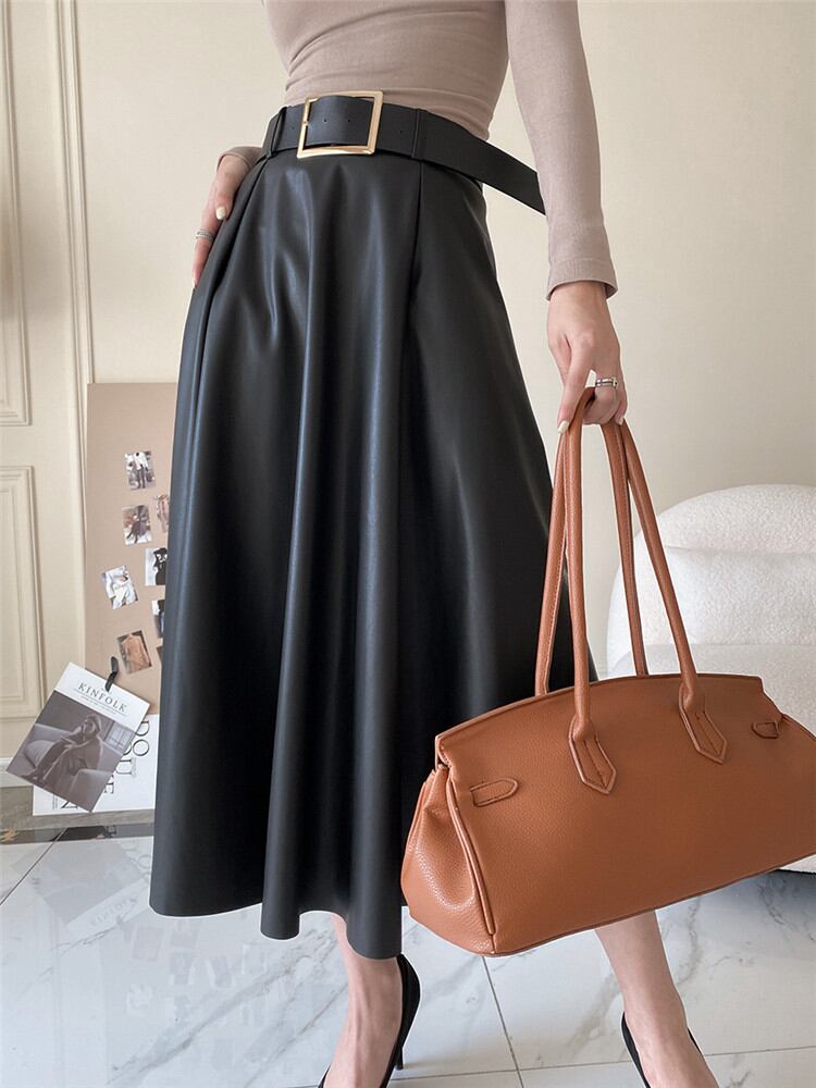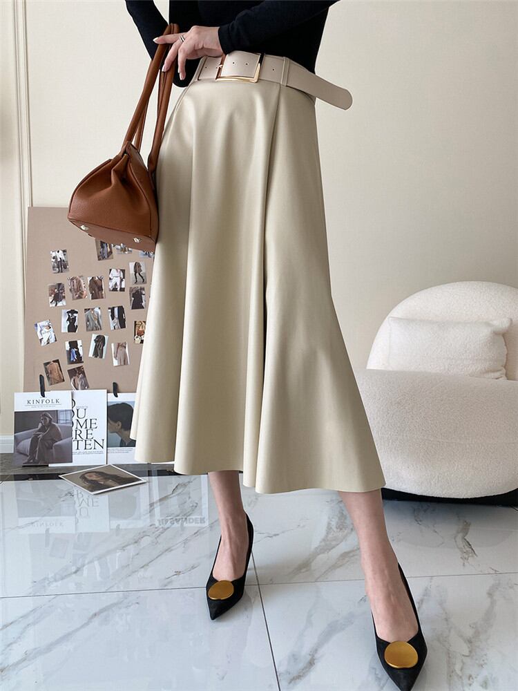 ◎【送料無料】2021年秋冬新作 Aライン ハイウエスト 中・長セクション 大きい裾 PUレザースカート