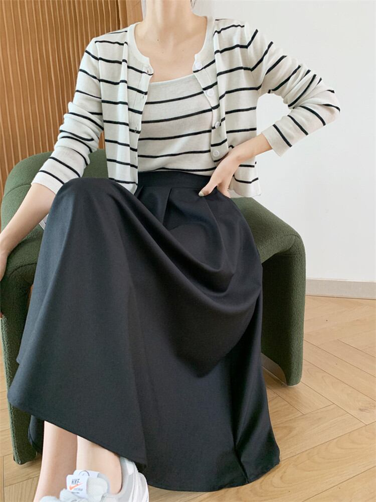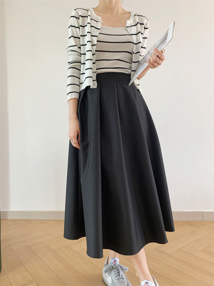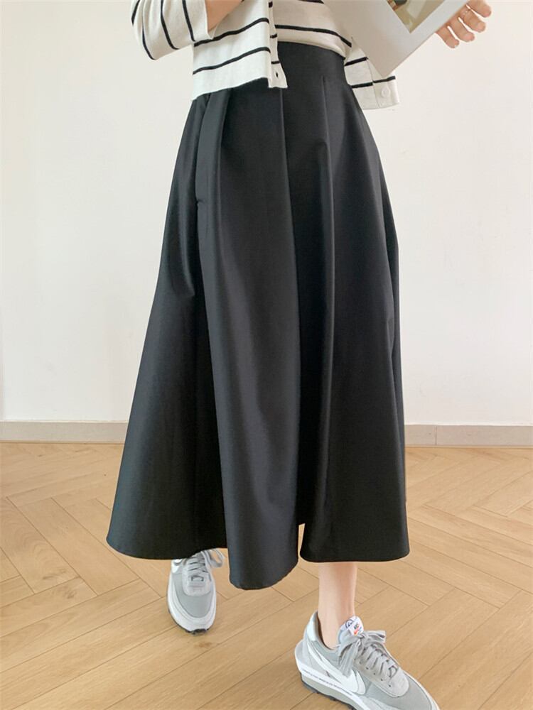 ピュアカラー スカート シンプル 女性 ブラック ハイウエスト スリム 大きい裾 Aラインスカート