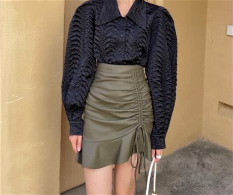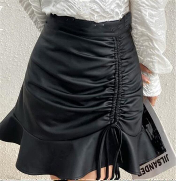 デザインセンス フォールド フリル ミニスカート ハイウエスト スリム PU スカート セクシー