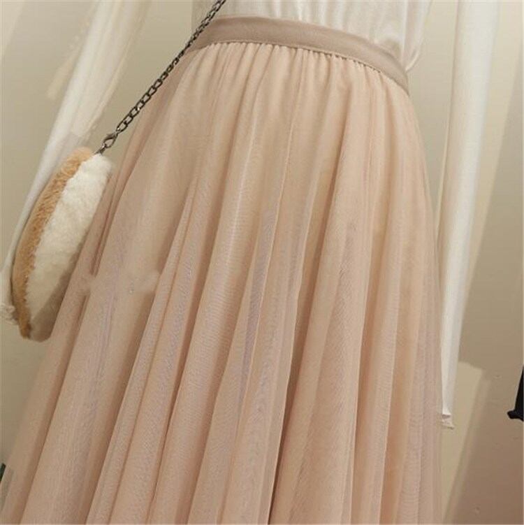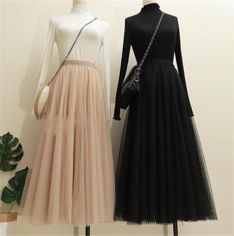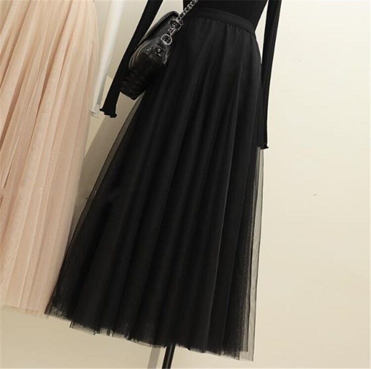 韓国ファッション 上品映え チュールスカート ふくらんでいるスカート ハイウエスト スリムフィット Aライン 大きい裾 中・長セクション プリーツスカート