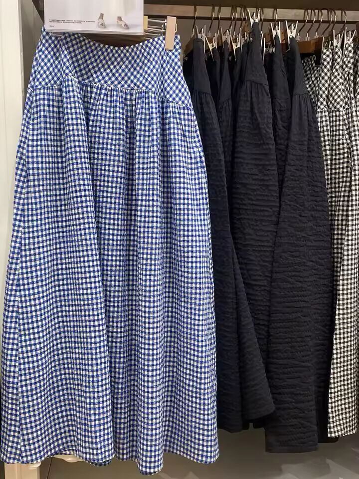 【送料無料◎】 夏用カジュアルチェック柄ハーフ丈バブルスカートAラインアンブレラスカートハイウエストミディ丈無地通勤スタイルレディーススカート