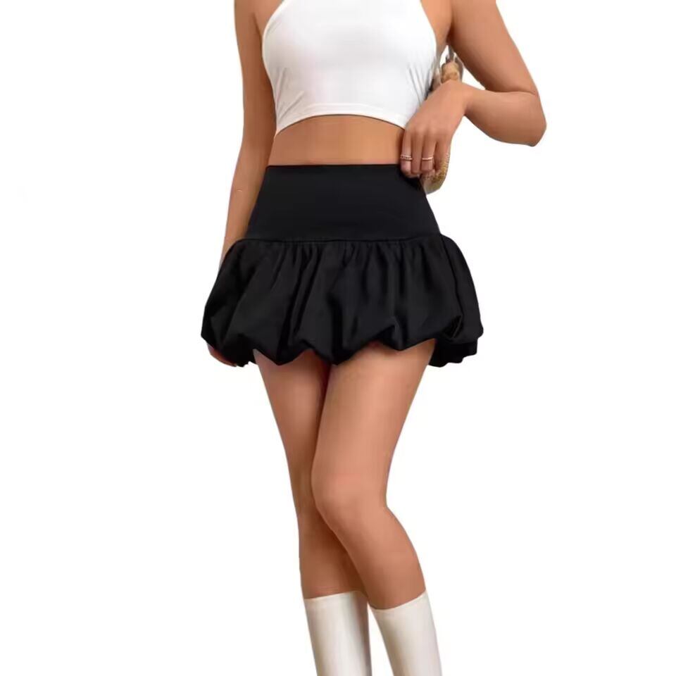 【送料無料◎】 女性フリル裾シャーリングふわふわショートスカート弾性ウエストパッチワークプリーツバブルミニスカート女の子かわいいバルーンスカートストリート
