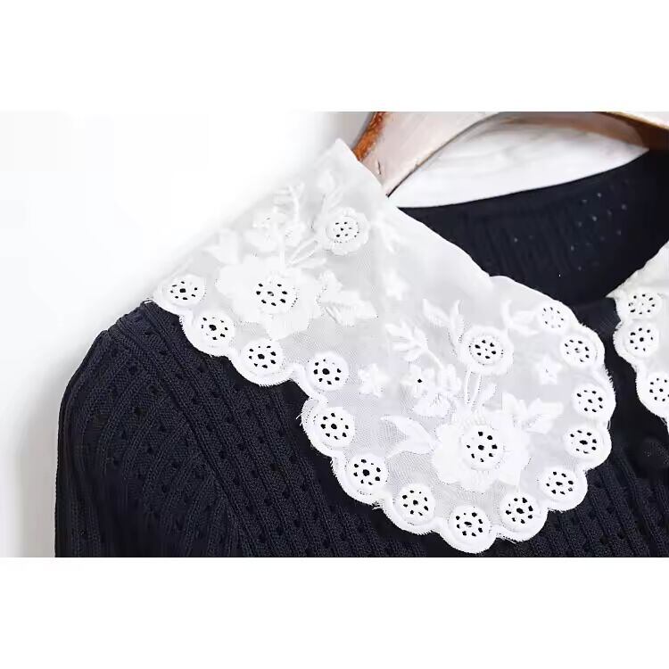 【送料無料◎】 おしゃれなニットワンピース 白いレース襟 長袖ミディ丈スカート バブルヘム ハイウエスト Aラインシルエット シティウォークスタイル