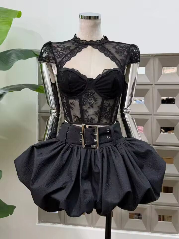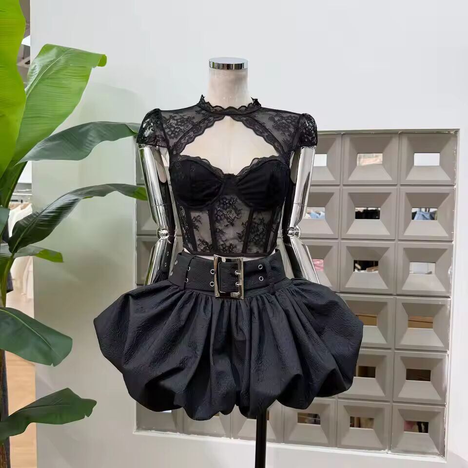 【送料無料◎】 DFDG レディース 春夏 レース シースルー コルセット クロップトップ ワイドベルト バブルヘムスカート セット クラブウェア 2026 トレンド フェミニン ファッションセット