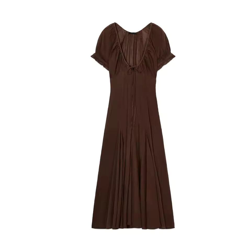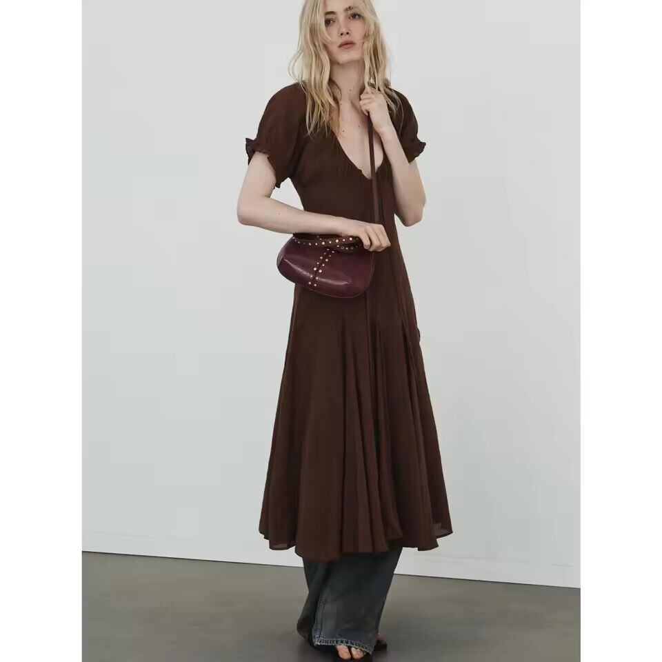 【送料無料◎】 春の新作レディースディープ V ネックバブルスリーブシフォンウェーブワイドヘムミニドレススタイリッシュな都市通勤 A ラインスカートポリエステル繊維