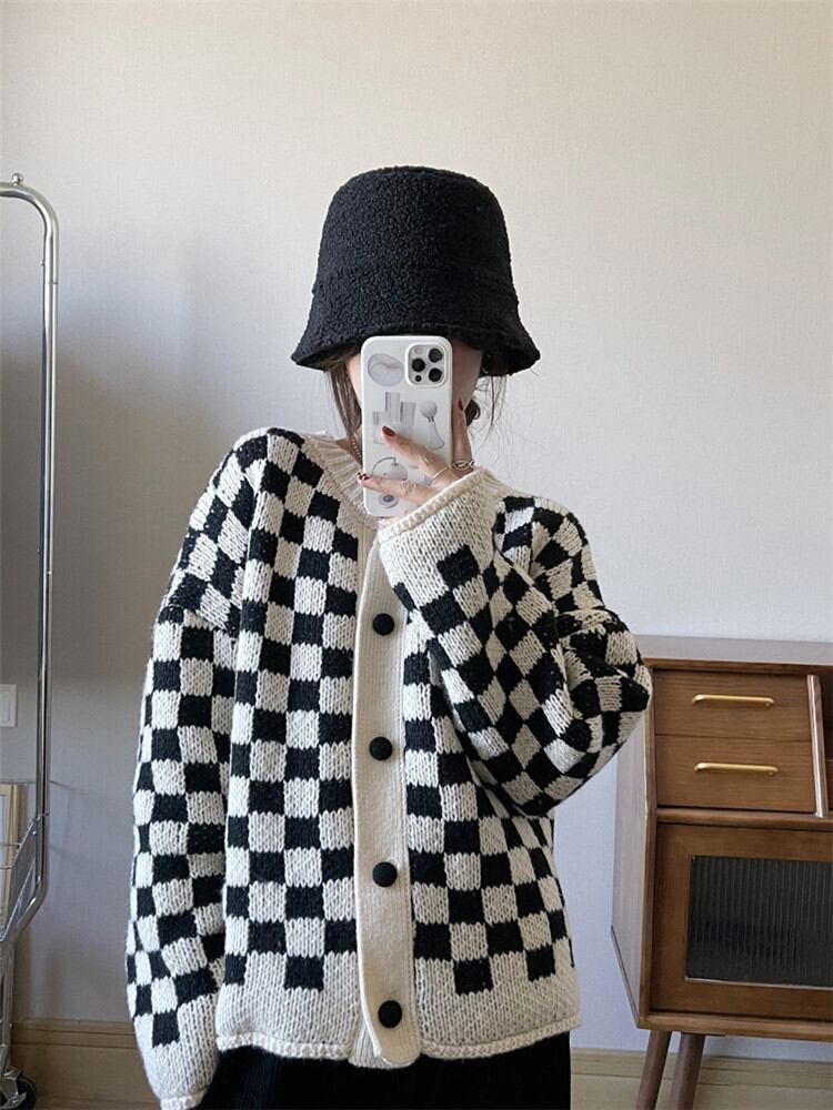 チェック柄 カーディガン ニット カラーマッチング 気質 シンプル カジュアル トップス 女性 ゆったりする