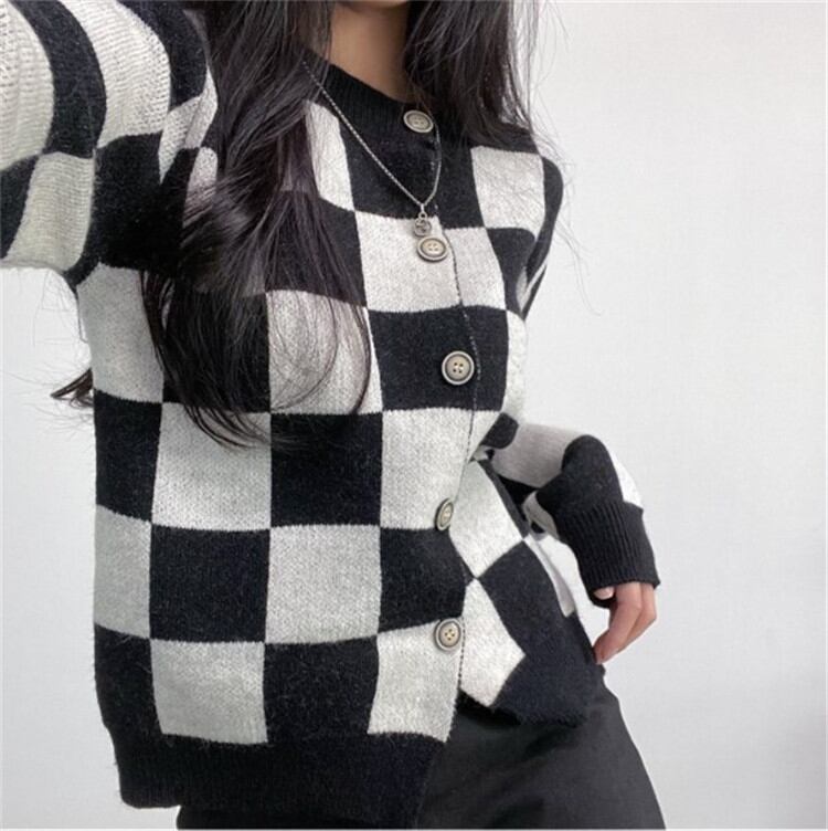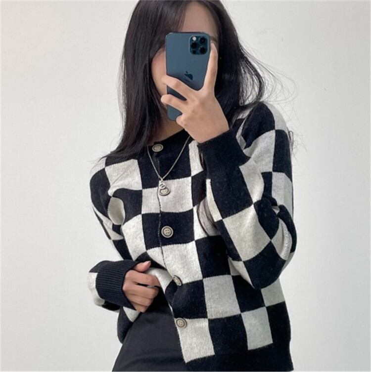 カラーマッチング チェック柄 単体ボタン ゆったりする ニット カーディガン コート